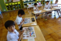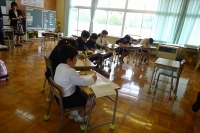 ↓ 書写 1,2年合同で正しい姿勢の確認をして書きました.2年生はお手本を見せ,1年生は2年生のように書こうと頑張っています.