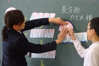 ↓ 5.6年複式学級で町複式教育部会を実施し,刈安小学校の先生方と合同研修会をしました.複式学級では,1つの教室で1人の教員が2学年の授業を進めます.5年は内のり,容積の求め方を学習し,6年生はかける数に着目し積の大きさの見当が付くわけを話し合いました.授業の中盤には,あれ?本当かな?どうするかな?等思考を深める場面を作ることを本校の共通実践としています.