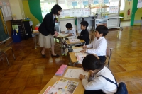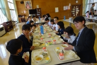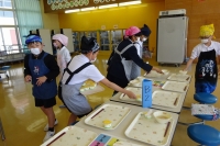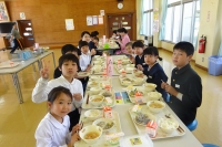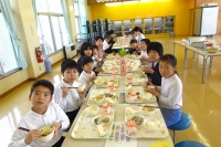 ↓ランチルーム給食,開始しました.新しいなかよしグループで,行儀よく,ちょっぴり緊張気味で食べています.高学年の当番さんが手際よく準備をしてくれています.