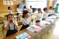 ↓ 1,2年音楽 歌声指導専門の先生をお招きし,きれいな声で歌う学習をしました.口を開けるポイントを教えていただき,試してみると,すぐに変化が表れました.楽しくて笑顔いっぱいの時間でした.定期的に指導に来て下さるようお願いしました.またお会いできるので楽しみです.
