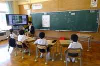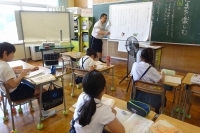 ↓5,6年 複式算数 5年生の体積の求め方と6年生の分数のかけ算の授業を一人の教員が同時に指導します.子供たちは,学習ガイドを中心に自分たちで授業を進め,要所要所で指導者が出ます.2つの学年同時に指導しますので,巧みな指導力が必要です.児童による学習ガイドの力も育成され,考えを比較し自分たちでどうしてそのような答えになったのか追究していきました.