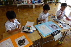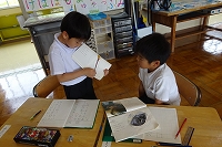 ↓ 1年 国語 自分がくちばしクイズで紹介したい鳥を図鑑を見て選んでいます.うまくクイズが作れるでしょうか.意欲は満々です.