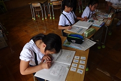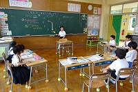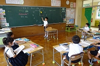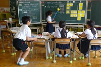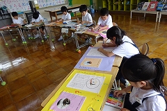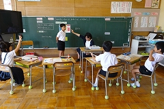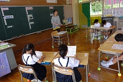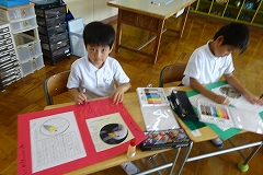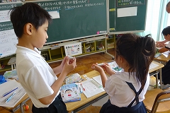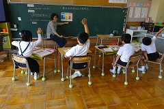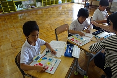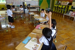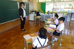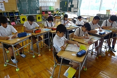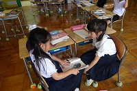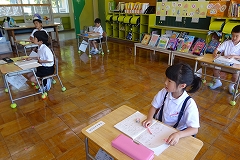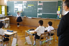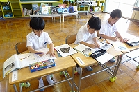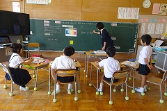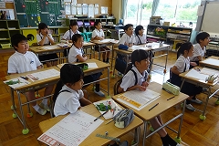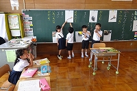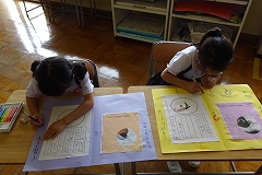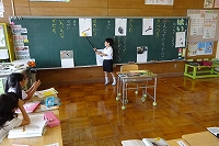 ↓ 1年 本校は,少人数のため複式での授業を6年間で必ず経験します.そのため,自分たちでが学習を進める学び方を育てています.1年生にも,いよいよ学習ガイドを立てた学び方を指導ました.