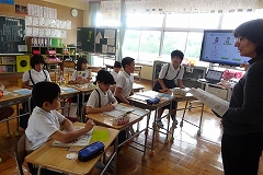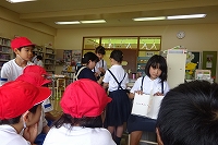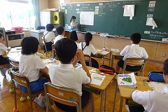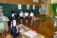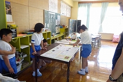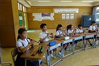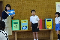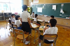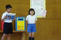 ↓ 2年生が町探検での学びを給食の時に全校に伝えました.はっきりした声で自信満々に伝えることが出来ました.声をかけあって子供たちで自主的に練習していたそうですよ.
