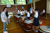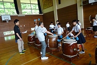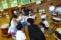↓ 5,6年生のでんでこ太鼓練習,水の表現が伝わるように動きを工夫しました.