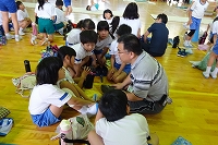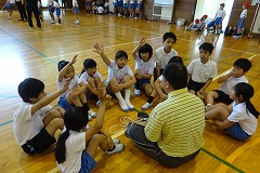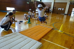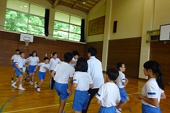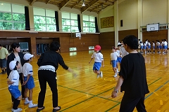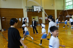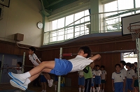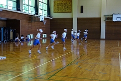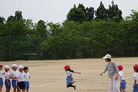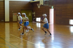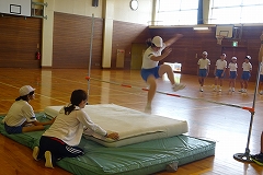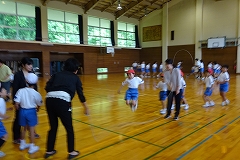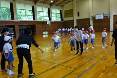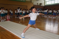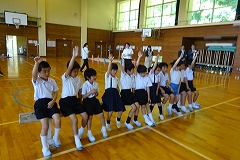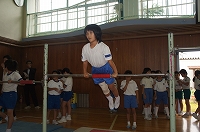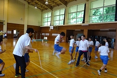 ↓ 1.2年体育 合同でしました.2年生の跳び方を見習って,1年生は思い切って大繩に入り,大きくジャンプ! 大成功です.