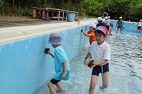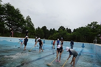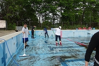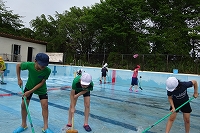 ↓ 月曜日のプール掃除に先駆けて,職員で下掃除をしました.木の葉や下にたまった泥等を取り除き,簡単に水を流しました.月曜日は子ども達と一緒にピカピカにしたいと思います.「夏近し」です.