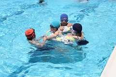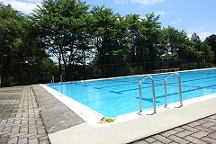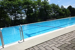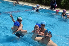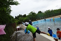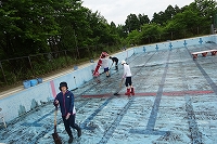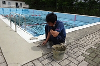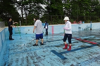 ↓ プールサイドのコンクリートが破損し,子供たちは裸足でプールサイドを歩くので何とか早急にしなければと思い,人工芝を敷く計画もあったのですが,予算オーバーで困っていました.すると,PTAのお父さんが早速,修繕してくださいました.大変助かりました.暑い中,本当にありがとうございました.