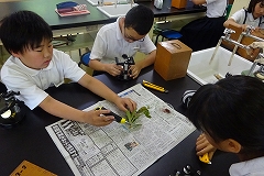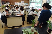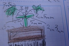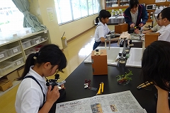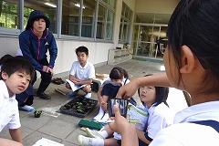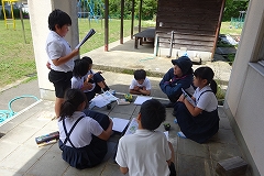 ↓ 4年理科 暑くなると,植物や生き物はどのように変化するか調べています.これはもみじの枝が春のころと比較し,どれだけ伸びているか物差しで枝の長さを測定しているところです.中庭のスイレンも見事に花を咲かせています.1年生の朝顔もつるが伸び,つぼみも見られるようになりました.何色の花が咲くのでしょうか.
