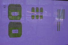 ↓ 2年算数 10が10個で十の位がいっぱいになったらどうなるのか,繰り上がりの仕組みをカードとチョークを使って説明しています.