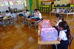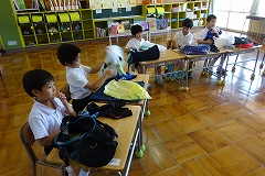 ↓ 久しぶりにさわやかな天気になりました.しかし,予定していたプール開きは,気温と水温を合わせて50度には達せず,風もありましたので,来週に延期します.プールの水はたっぷり入りました.(笠野小のプールは緑に囲まれ,まるでリゾート地にでもいるかのようです.)あとは水温,気温が上がるのを待つばかりです.1年生教室では着替えの練習をしました.プールの学習時間を確保するには,着替えを素早くすることも大切です.今日は,とても上手にみんな着替えることが出来ました.