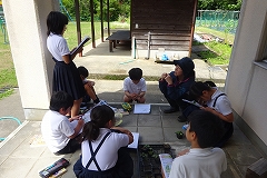 ↓ 3年生 暑くなると 季節の移り変わりとともに自然はどのような変化をしているのか調べに笠野の森に入りました.