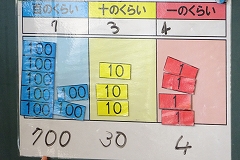 ↑ 2年算数 数字カードを用いて,数を作りました.「百の位は100が7個なので700,十の位は10が3個なので30,一の位に1が4個なので4,あわせて734です」というように,何回も練習しました.十進位取り記数法を身につけています.