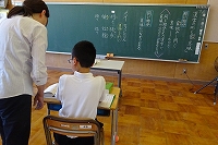 ↓ 1年 本校は,少人数のため複式での授業を6年間で必ず経験します.そのため,自分たちでが学習を進める学び方を育てています.1年生にも,いよいよ学習ガイドを立てた学び方を指導ました.