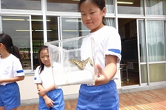 ↓ さなぎからアゲハ蝶に羽化しました.3年生と先生に見守られ,まぶしい大空に高々と舞い上がりました.卵を産みに,また,笠野小学校にきてくださあい.