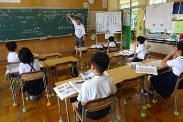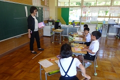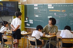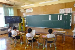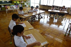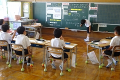 ↓ 1年 本校は,少人数のため複式での授業を6年間で必ず経験します.そのため,自分たちでが学習を進める学び方を育てています.1年生にも,いよいよ学習ガイドを立てた学び方を指導ました.