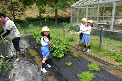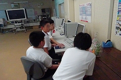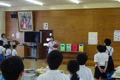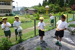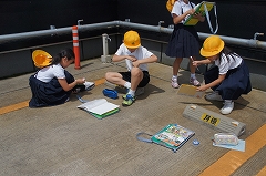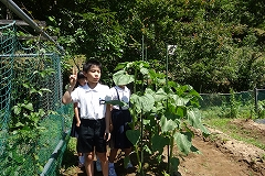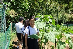 ↓ 4年理科 暑くなると,植物や生き物はどのように変化するか調べています.これはもみじの枝が春のころと比較し,どれだけ伸びているか物差しで枝の長さを測定しているところです.中庭のスイレンも見事に花を咲かせています.1年生の朝顔もつるが伸び,つぼみも見られるようになりました.何色の花が咲くのでしょうか.