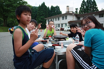 ↓夜は外で,陶板焼き,豚肉に野菜仲良く食べて絆が深まりました.