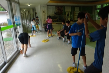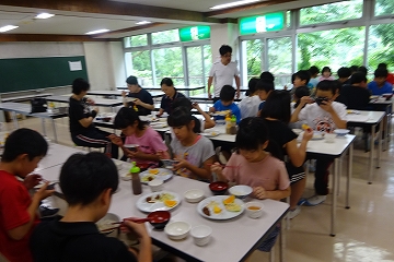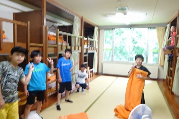↑朝食前は,掃除をして部屋を片付けました.掃除はばっちりでしたが,4つ隅をそろえて毛布をたたむ作業はあまり慣れていないのか,苦戦しましたが,協力で乗り切りました.おいしい朝ご飯は食堂でいただきました.ボリュームたっぷりの朝食にびっくりしていました.活動のエネルギーが補充されました.↓