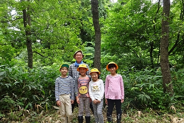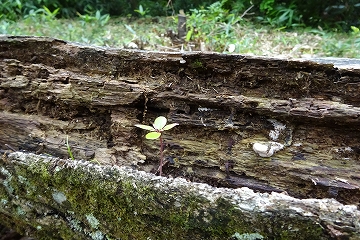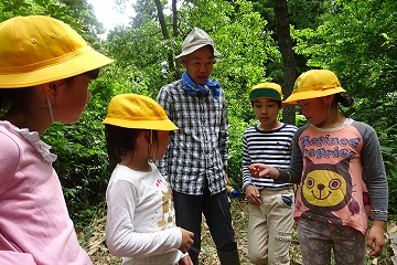 ↑6年前木を切り倒してベンチを作ったそうです.その間から木の芽が生まれていました.朽ちた木の栄養分をもらって,新しい生命が生まれているのです.まさしく「森は生きている」です.子供たちはしばらくどんなが音が聞こえてくるか耳を澄ましました.さくさく,さわさわ,さらさら…先生とオノマトペの話で感性を耕していました.