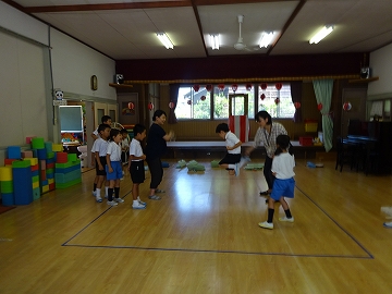 ↓1,2年生は笠谷保育園へ行って交流をしてきました.小学生のかっこいいところを見せたいと,発表の練習を頑張りました.今月の歌や鍵盤ハーモニカの演奏,大繩発表に司会進行やあいさつの言葉等から,きっと頼もしいお兄さん,お姉さんの姿となって保育園の皆さんの心に届いたと思います.保育園の子供たちとの交流では,大型転がしドッジボールを行いました.保育園の子供たちと一緒に本気で楽しむことが出来みんな満足していました.また,学校の方へも遊びに来てください.今日はありがとうございました.