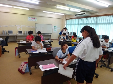 ↓ 算数,国語のサマースクールはエアコンのあるPCルーム,校長室,そして職員室で行いました.中学生がミニ先生となり,大活躍でとても助かりました.「説明の仕方が上手ですね」と中学生をほめると,「笠野小で鍛えられましたからね」と大変うれしい反応が返ってきました.このような子を中学校に送り出せるよう,ますます頑張りたいと思いました.