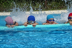 ↓ 久しぶりの真夏日です.やっとプールに入れました.3,4年生はビート板を持って息継ぎの練習を開始しました.25M泳ぎきるには,何としても息継ぎをマスターしなければなりません