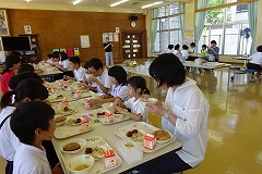 ↑給食は七夕メニューで,冷やし中華や星形のハンバーグ,流れ星ゼリー等季節感たっぷりでした.4年生で丹精込めて作った胡瓜を収穫し,いただきました.漬物にしていただきます.とってもみずみずしく,胡瓜の香りが夏らしかったです.給食の準備を待っている姿も立派です.高学年のリーダーがしっかり下級生に声をかけていました.