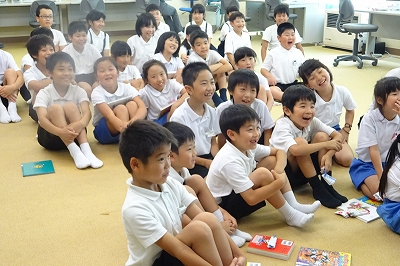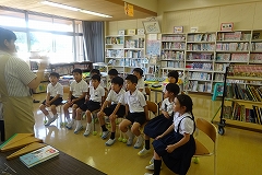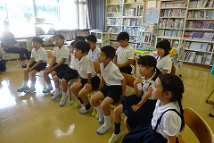 ↓ 1,2年生もフックトークや読み聞かせでお話の世界に引き込まれています.今年の夏休みは図書館の本をバーコード化しますので貸出期間は短くなりますが,たくさん本を借りて読んでください.