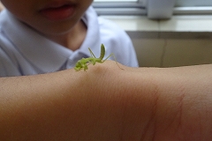 ↓ 2年生が畑で金時草を収穫しました.調理場へもっていき,料理をしていただくことにしました.今日の給食のメニューにもう加わっています.自校給食のよさでありがたいです.しかし,笠野小調理場での給食も,あと2日です.