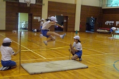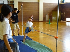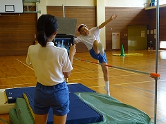 ↓ 5,6年体育 走り高跳びのフォームのめあてを各自考え,班のメンバーに伝えて,できているかアドバイスをしてもらいました.動画でも撮影し,班のみんなで確かめました.「足が伸びていていいね」「足が胸に引き寄せられているよ」「手を広げていてバランスがとれているね.」見てほしい視点に沿ったアドバイスもだんだん上手になってきました.