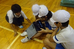 ↑ 5,6年生高跳び練習です.フォームを映像にとって確認して自分の課題について改善しています.