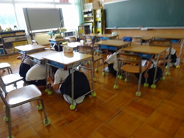 ↓シェイクアウトいしかわ 10:50 地震発生による訓練及びそれに伴い給食室からの火災を想定して訓練を実施しました.シェイクアウト(災害を振り払う)の安全行動「しゃがむ」「隠れる」「じっとする」はしっかり行動できました.津幡町消防署から講師をお招きし,この訓練による講評をいただきました.その後,いざというときに備えて行動できるよう,水消火器での消火訓練を実施しました.消火器は3つの動作①栓を抜く,②ホースを火に向ける,③レバーを強く握るです.5mくらい離れたところから少しずつ火に近づいて消火します.4年生以上が体験しました.