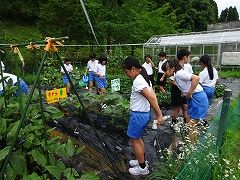 ↓ 2年生,畑で野菜の収穫です.収穫したきゅうりとなすは,調理室で料理をしていただき,今日の給食でみんなでいただきました.ポテトサラダのきゅうりとみそ汁のなすが学校園で収穫した野菜です.学校に調理場があるおかげですが,もうすぐ調理場ともお別れとなり,さびしくなります.今日の給食は,6年生のリクエスト給食で,リクエストのメニューは「わかめご飯」でした.ちょっぴり塩味で食欲がわき,普段摂りにくい無機質の栄養素もばっちりでした.
