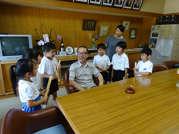 ↑ 1年生が地域の太鼓の先生から太鼓のばちをプレゼントして頂きました.太鼓の先生お手製のばちです.夏まつりでは1年生の希望者もでんでこ太鼓デビューです.この地に伝わるたいこの響きを「ふるさとの響き」として,心の中に残してください.「太鼓をたたきたい人」1年全員手を挙げていました.このばちは「メープル」の木でできています.力に合わせてばちを選ぶことが出来ます.1年生もこれから太鼓練習できますね.地域の太鼓の先生には,心より感謝申し上げます.
