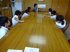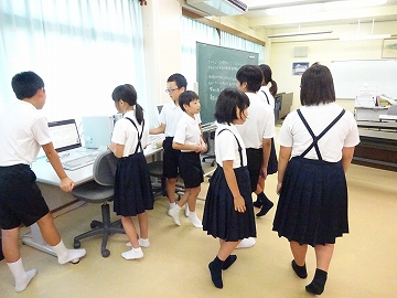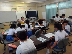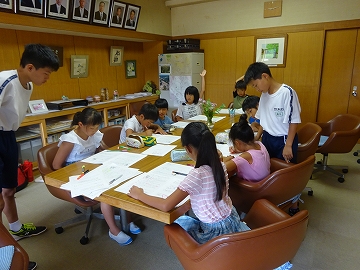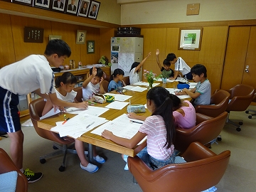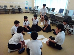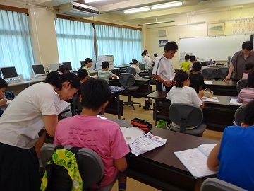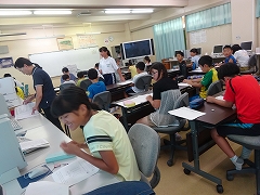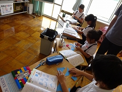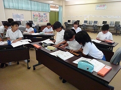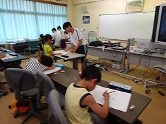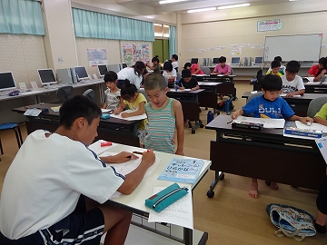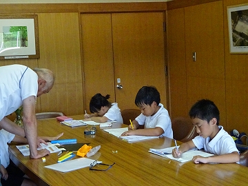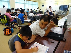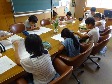 ↓ 算数,国語のサマースクールはエアコンのあるPCルーム,校長室,そして職員室で行いました.中学生がミニ先生となり,大活躍でとても助かりました.「説明の仕方が上手ですね」と中学生をほめると,「笠野小で鍛えられましたからね」と大変うれしい反応が返ってきました.このような子を中学校に送り出せるよう,ますます頑張りたいと思いました.