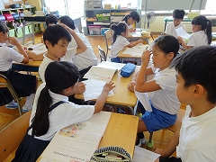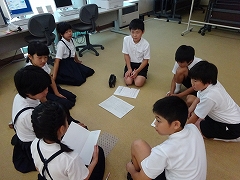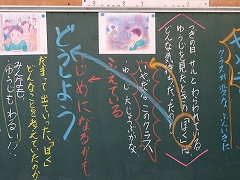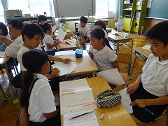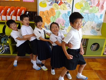 ↓ 3,4年道徳 「わらっちゃだめだよ」みんなにつられて,つい,よくないことをしないことをしてしまうことはないかな?この教材は,ゆうじくんを「さる」と言ってみんなが笑ってしまう,初めはゆうじ君自身もキッキーと猿の真似をしたが,みんなのからかいがエスカレートしてしまう,ぼくは,笑わない,その代わり,黙って教室を出ていったという内容で,なぜ「僕」は黙って教室を出ていったのだろうかと,グループに分かれて話し合いました.いじめにエスカレートしないでストップさせる心についてみんなで考えました.