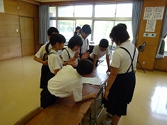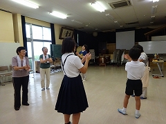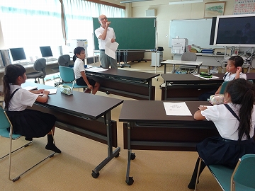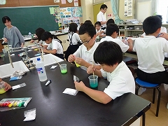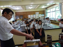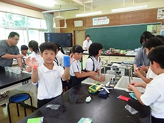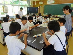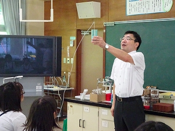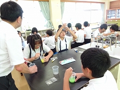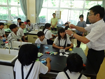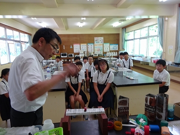↓津幡町のまちなか科学館の館長さんをお招きして,科学の面白さを体験する授業をしていただきました.もうすぐ夏休み,科学研究の題材のヒントや研究の進め方を教えてくださいました.もう,テーマが決まっている人もいましたが,追究することの楽しさを教えていただきました.
