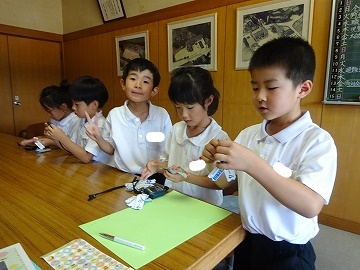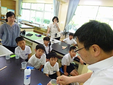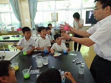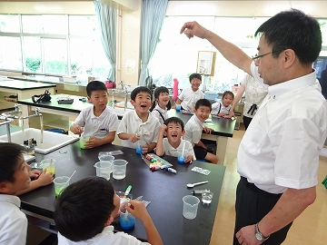 ↑ 科学研究のテーマも提案をいただきました.力のある紙の折り方,よく飛ぶブーメランはどんな形かな?よく跳び上がるびっくりボールはどんな分量か?家の周りを区分し,雑草の種類を比べる,紫陽花の花の色の研究等,日常の不思議なことからいろいろと条件を変えて研究を広げていくとよいそうです.各学年1時間ずつでしたが,科学の面白さや不思議さをたくさんの実験から体験させていただきました.ありがとうございました.