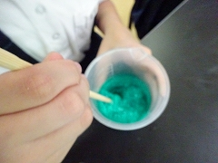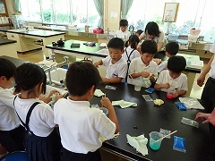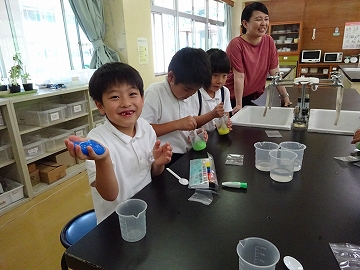 ↑ まずはスライムづくり,生き物のような感触に子供たちは大歓声をあげていました.