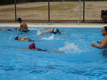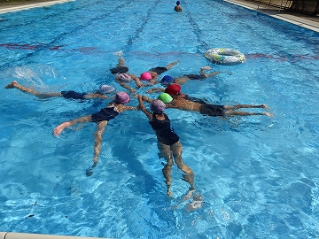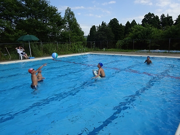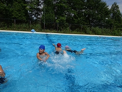 ↑ こちらは水球 水中キャッチボールです.上級生が下級生に声かけて楽しく遊んでいます.