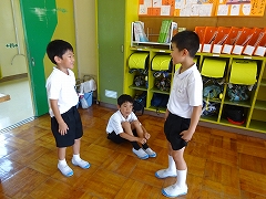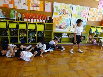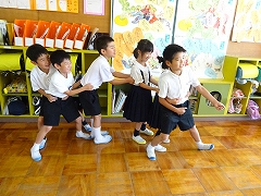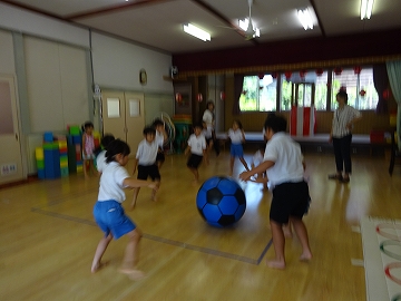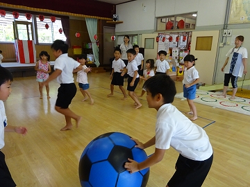 ↓1,2年生は笠谷保育園へ行って交流をしてきました.小学生のかっこいいところを見せたいと,発表の練習を頑張りました.今月の歌や鍵盤ハーモニカの演奏,大繩発表に司会進行やあいさつの言葉等から,きっと頼もしいお兄さん,お姉さんの姿となって保育園の皆さんの心に届いたと思います.保育園の子供たちとの交流では,大型転がしドッジボールを行いました.保育園の子供たちと一緒に本気で楽しむことが出来みんな満足していました.また,学校の方へも遊びに来てください.今日はありがとうございました.