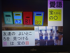 ↓ 1年生の音読劇 「大きなかぶ」です.いい笑顔で演じています.自分で会話を考えて付け足しています.後ろの掲示は自分で考えた吹き出しです.想像力が膨らみます.