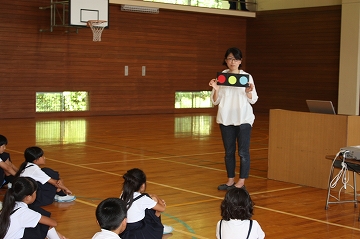 ↑生徒指導の担当からは,信号機の赤色は,「火遊びはしない」,黄色は「太陽注意,熱中症対策をする」,青は「プールの約束を守る」ことについてお話をしました.プールの担当からは,安全第一でプールに入ること,行き帰りの交通安全,寄り道禁止の指導をしました.安全に気を付けて,プールに入りに来てください.保護者の皆様のプール監視のご協力もどうぞよろしくお願いします.