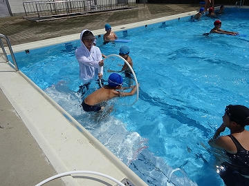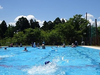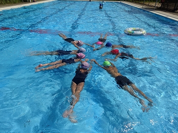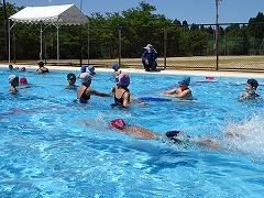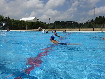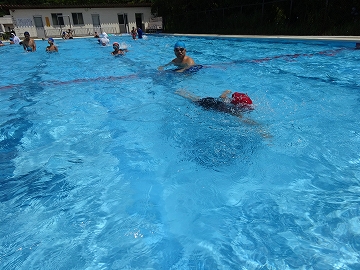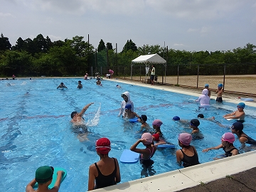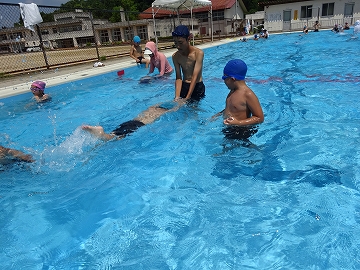 ↓水泳学習は,平泳ぎにチャレンジ,クロールのタイムのチャレンジ,息継ぎにチャレンジ,バタ足にチャレンジ,水慣れにチャレンジ,各コースで精一杯練習しました.晴天続きなので,プールは最高に気持ちよく,上達も早いです.中学生サポートボランティアの皆さん,地域の先生ご協力ありがとうございました.
