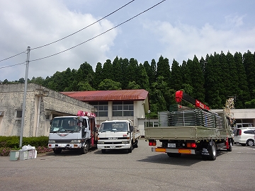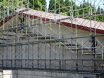 ↓ 体育館の屋根の工事の足場を組みました.体育館の周辺には近寄らないようお願いします.体育館は8月中は工事のため使用できません.