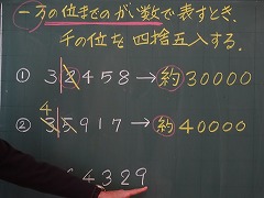 ↓ 4年生 算数 概数の学習に入っています。どの数字を四捨五入するのか問題をよく読んで答えます。