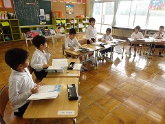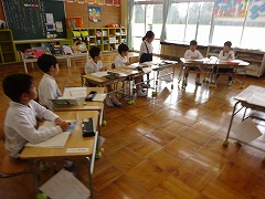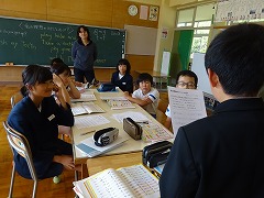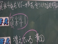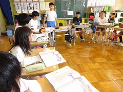 ↓ 複式ですから同時に5年生も同じ算数を学習しています。5年生は資料を読む学習です。①どの資料の、②どこから、③どう読んだからそう思ったか、根拠と理由が必要です。これをはっきりさせることで、あいまいな学習から、深い学習へ変化していきます。聞き取れなかった子はわからなかったことをちゃんと質問できる、すると、聞き取れた子が、「今、◎◎さんの言ったことは、~ということでした。」と、すかさず丁寧に言い換え、確認できる学習の土台がすばらしいです。教師に頼らず自分たちで解決しようと頑張っています。