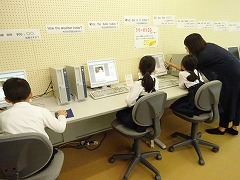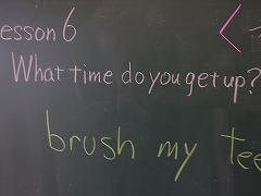 ↓6年 英語 理想の1日のスケジュールを英作文して発表です。I get up at nine.と聞こえてきました。