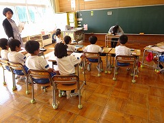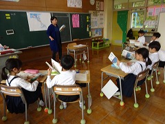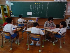 ↓ 2年算数 いよいよ新しい計算です。5人乗りのジェットコースターがいくつあるかという話をしています。黒板で書きながら説明しているところが素敵です。